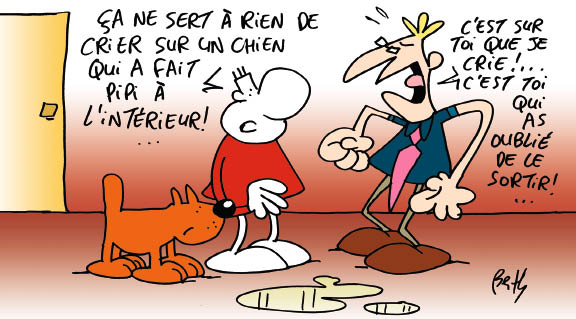 Pipi. « Certains comportements ne doivent pas mener à une punition. Gronder un chiot ayant fait pipi à l’intérieur, par exemple, ne sert à rien. Au contraire : à force d’être puni, le chiot risque de se cacher pour faire ses besoins. Pour lui apprendre à être propre, il faut l’emmener souvent dehors et le récompenser dès qu’il y fait ses besoins. Faire pipi à l’extérieur deviendra ainsi une habitude. »